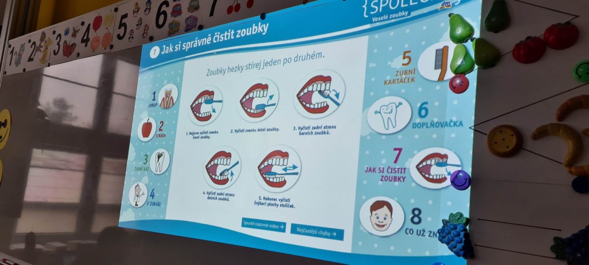Ukázaly dětem správnou techniku čištění zubů a vysvětlily důležitost zubní prohlídky. Děti s nadšením plnily úkoly na interaktivní tabuli, seznámily se se stavbou zubu, nakupovaly zdravé potraviny, doplňovaly do textu správné obrázky a nechyběl ani zábavný kvíz. Nakonec řešily pracovní list. Za svou pilnou práci žáci obdrželi preventivní balíčky dm drogerie.