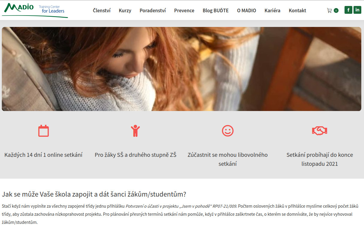 Škola se zapojila do projektu JSEM V POHODĚ. Jedná se o nízkoprahovou a anonymní službu psychologické pomoci a pomoci zvládání stresu pro žáky 8. a 9 tříd. Služba je poskytována zdarma společností Madio a je dotována Zlínským krajem.