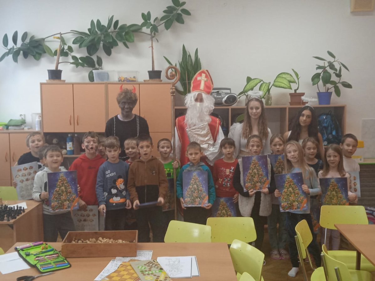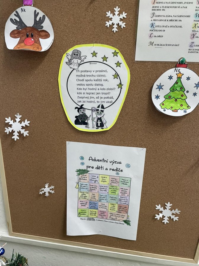 Prosinec se nesl v duchu Vánoc. Navštívil nás Mikuláš se svou družinou, přinesl každému adventní kalendář a kupodivu si čert nikoho neodnesl. První oddělení s paní vychovatelkou vyrábělo přáníčka a sladký dárek pro potěchu obyvatelů domova v Pačlavicích. Druhé oddělení si vyrazilo užít první sněhovou nadílku. Děti také malovaly, tvořily a vánočně zdobily třídy.