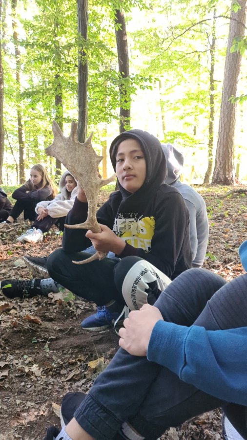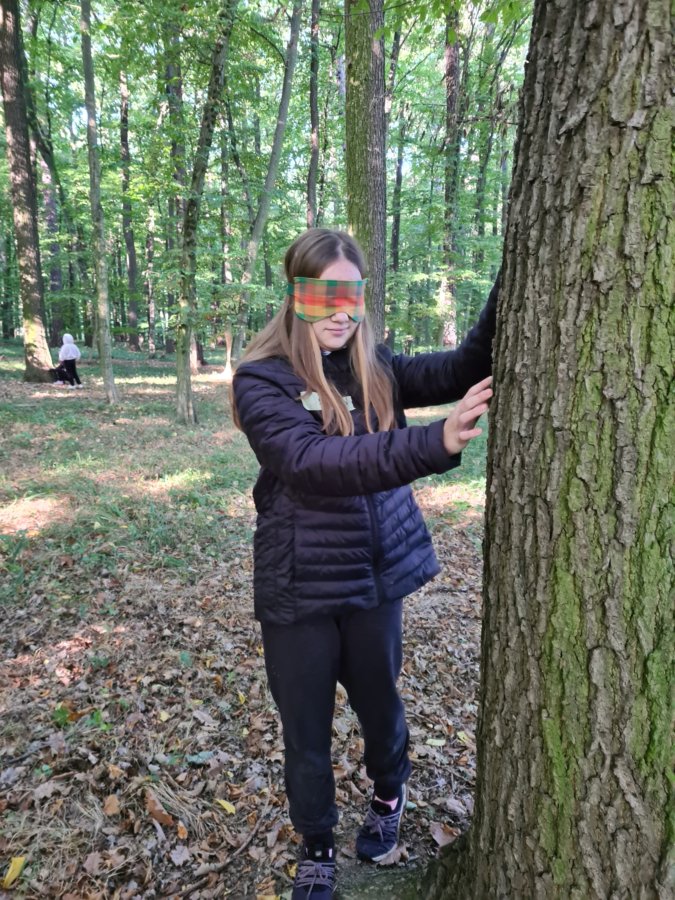 21. září jsme ráno vyšli ze školy do lesa za Morkovicemi, kde nás už čekali dva lesníci Pavel a Vítek. Naše první aktivita se uskutečnila v kruhu, kde jsme hádali jaký je rozdíl mezi parohy a rohy. Poté co jsme uhodli všechna zvířata na obrázcích a poslechli zvuky ptáků, jsme začali hrát hru ve dvojicích. Hra začala tím, že jeden měl oči zavázané šátkem a druhý z dvojice jej zavedl ke stromu. Ten, co měl zavázané oči osahal strom, tak aby ho potom našel. Tato aktivita se nám hodně líbila.