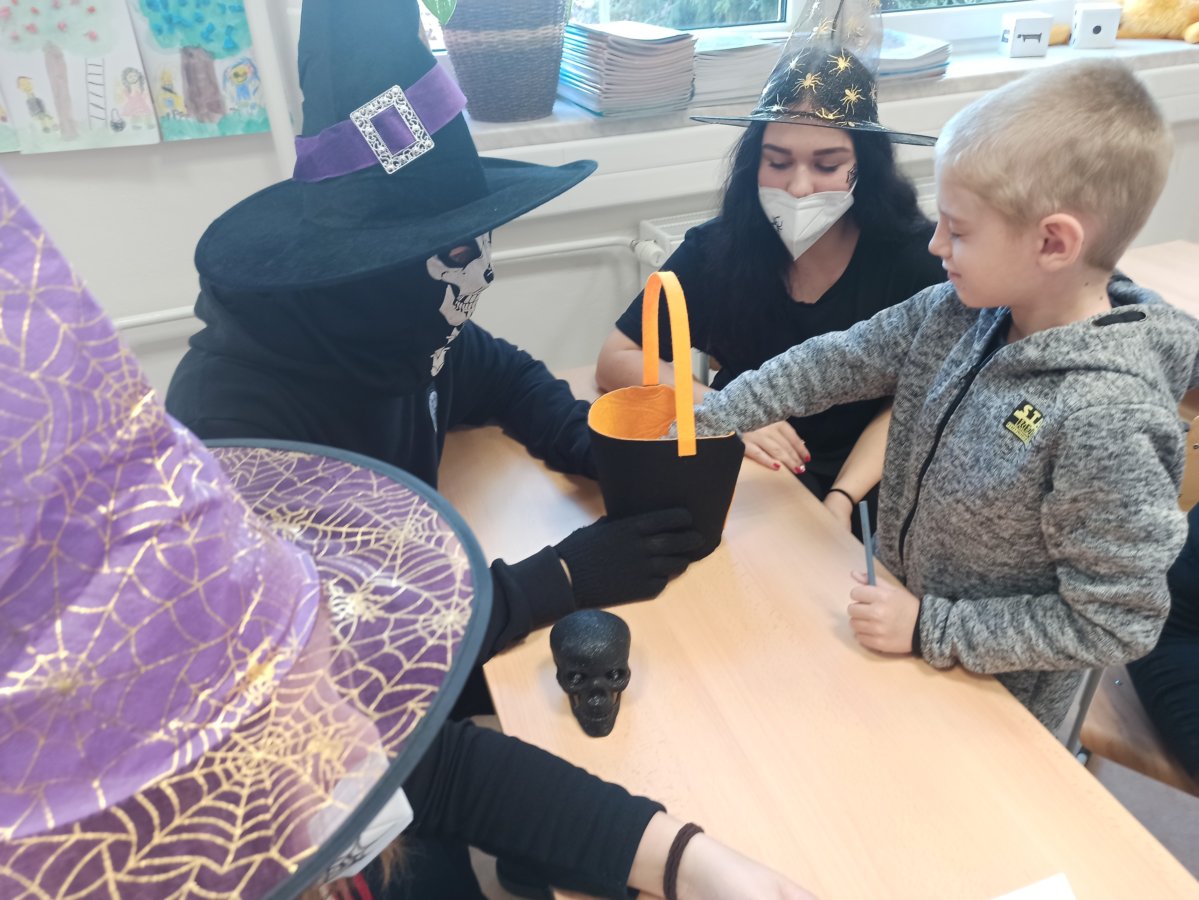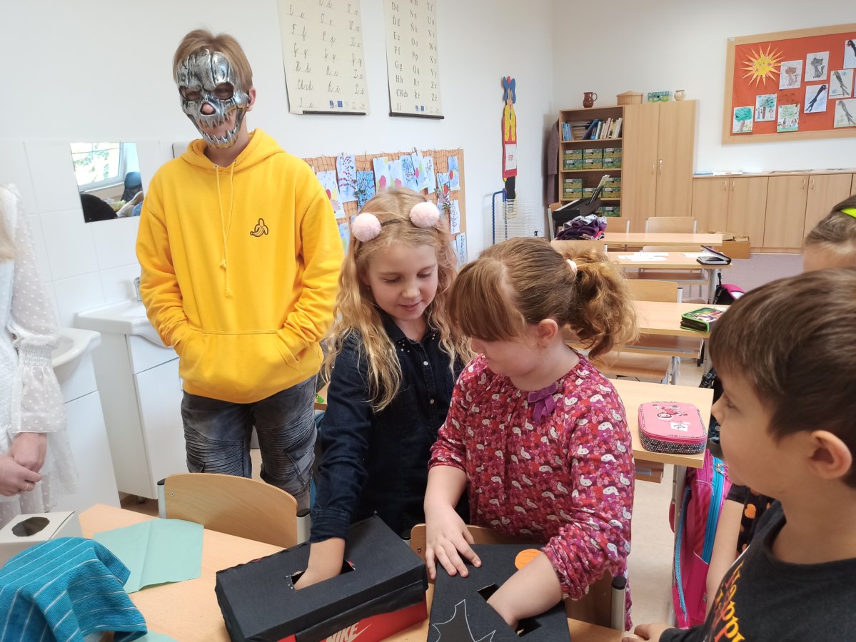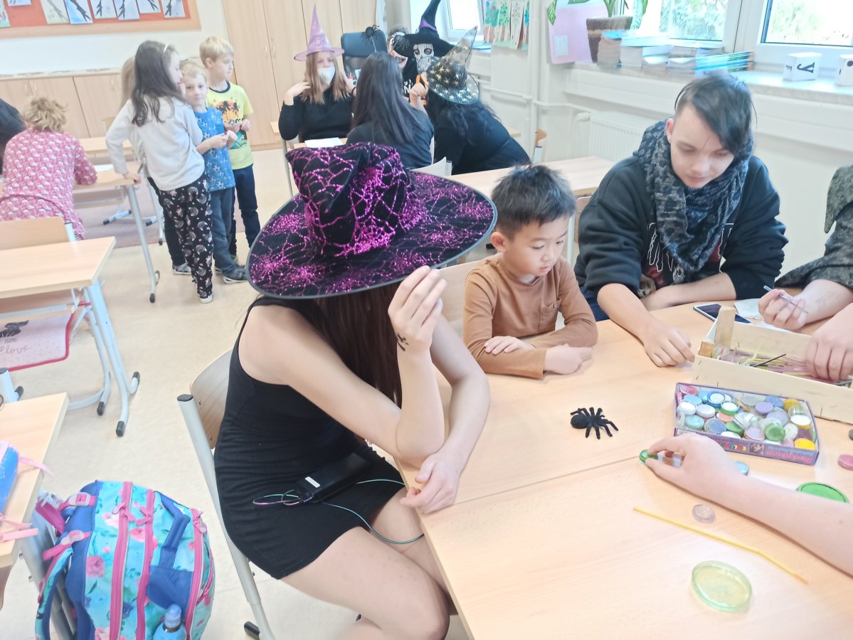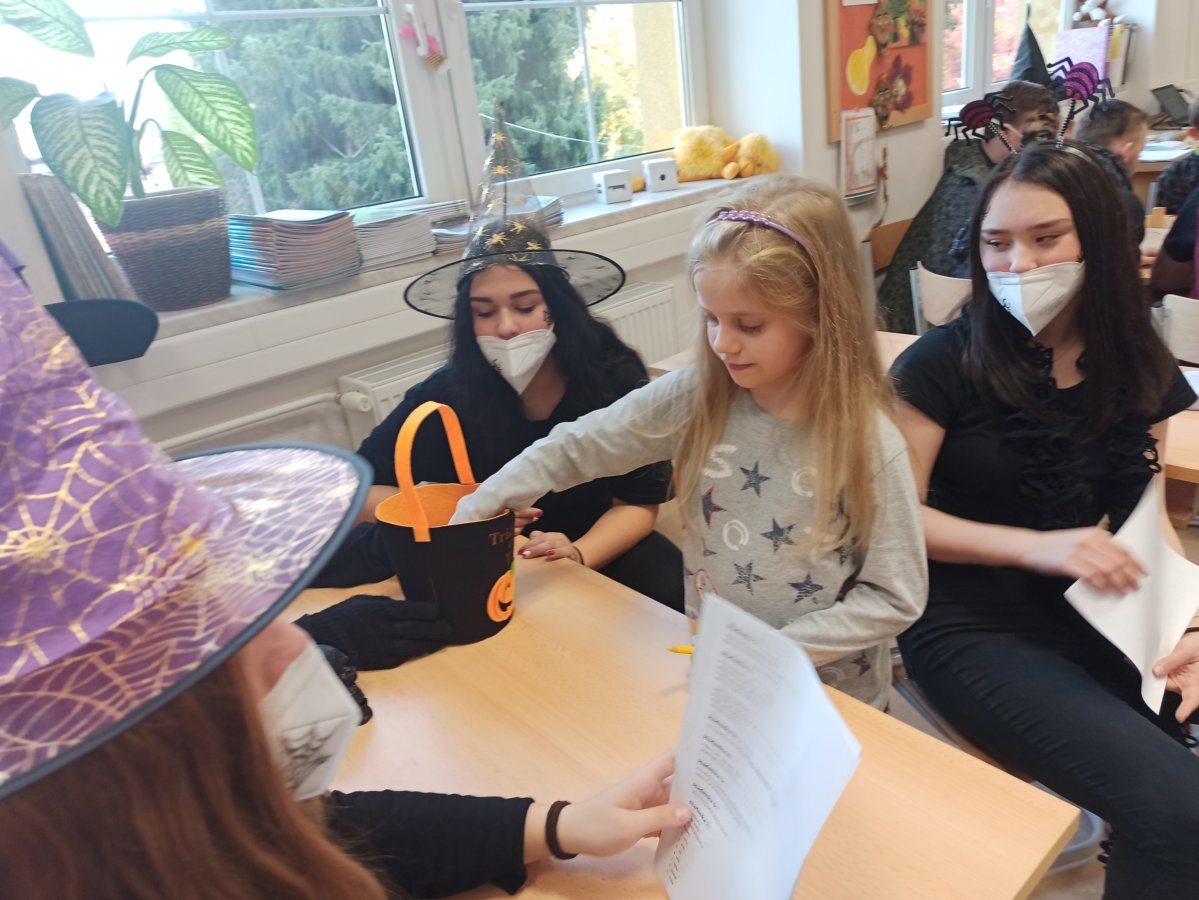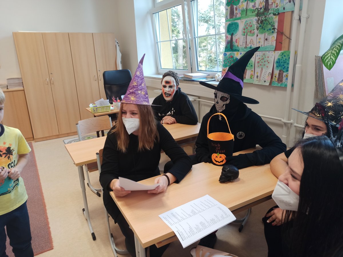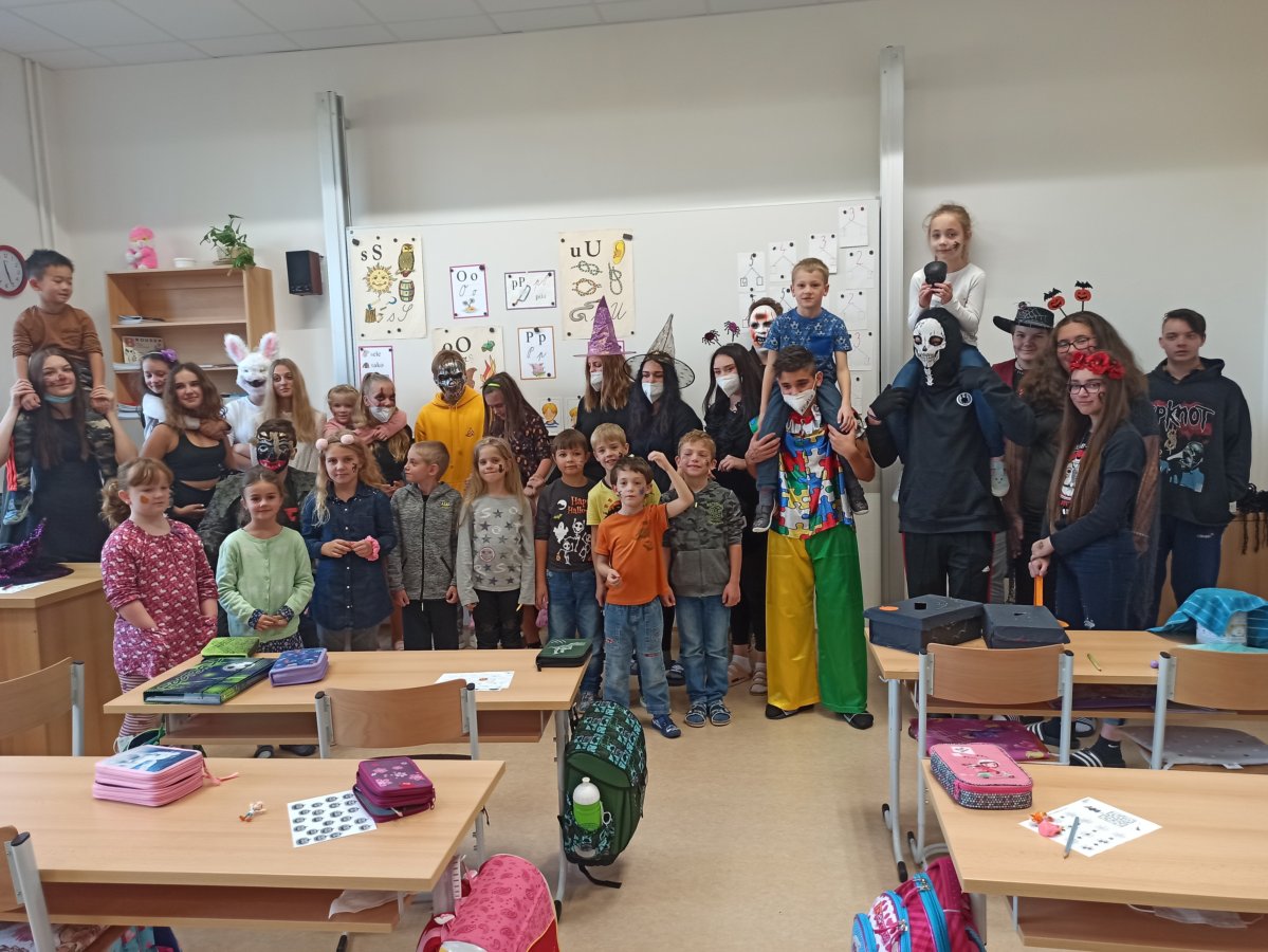 V pondělí 26. října 2021 navštívili prváky jejich patroni deváťáci přestrojení za různé halloweenské masky. Pro své mladší spolužáky měli připravené zábavné úkoly, např. najdi na obrázku stejně vyřezané dýně, spočítej pavouky, poraď čarodějnici cestu bludištěm..., nechybělo ani malování halloweenských motivů na obličej. Sladká tečka na závěr v podobě muffin s netopýrem byla hodně fajn.