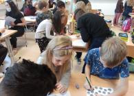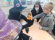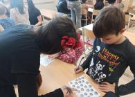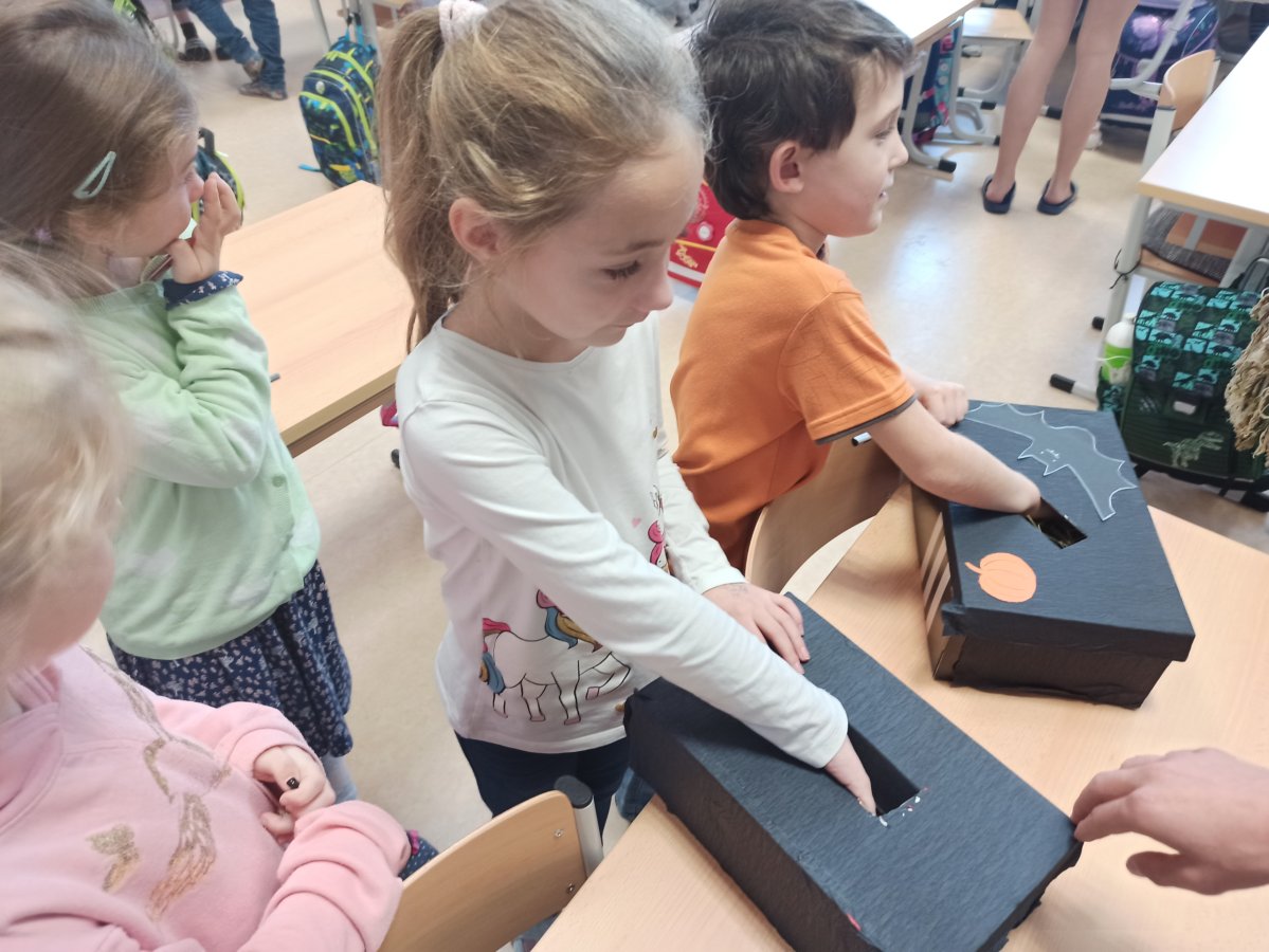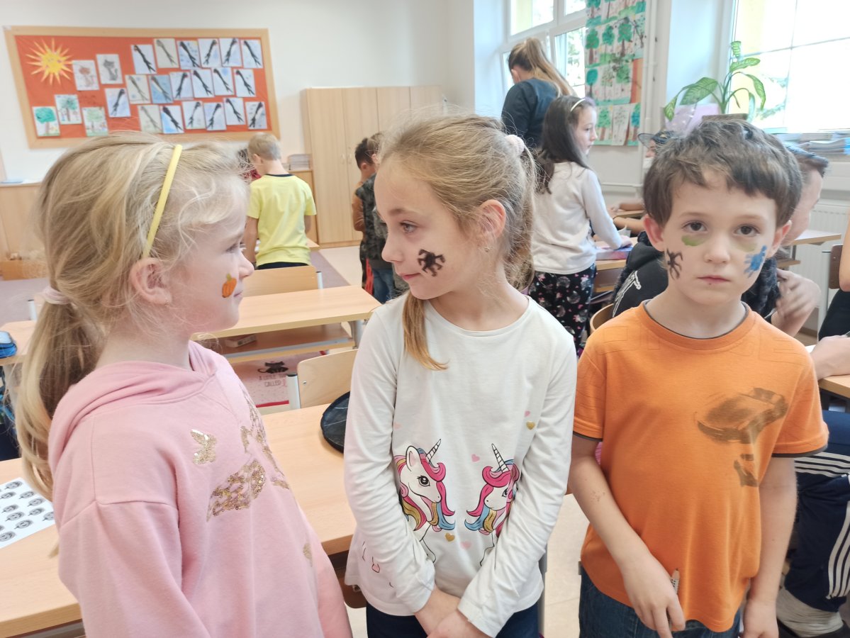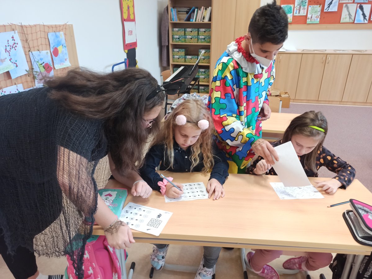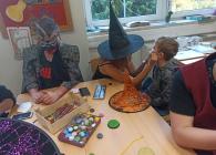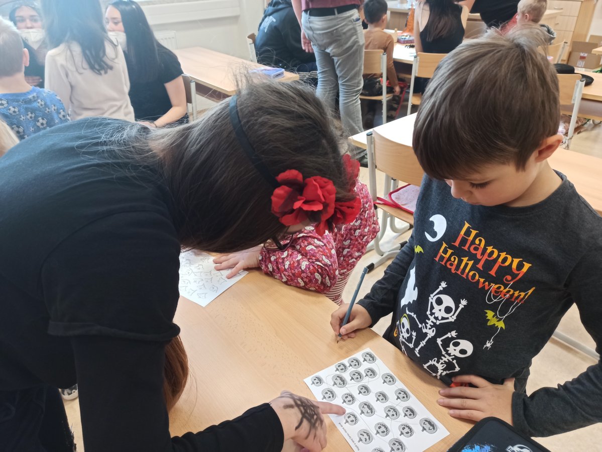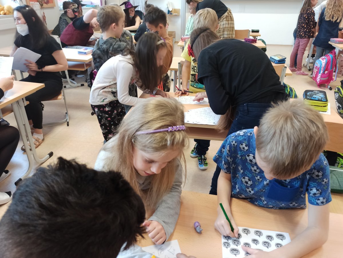 V pondělí 26. října 2021 navštívili prváky jejich patroni deváťáci přestrojení za různé halloweenské masky. Pro své mladší spolužáky měli připravené zábavné úkoly, např. najdi na obrázku stejně vyřezané dýně, spočítej pavouky, poraď čarodějnici cestu bludištěm..., nechybělo ani malování halloweenských motivů na obličej. Sladká tečka na závěr v podobě muffin s netopýrem byla hodně fajn.