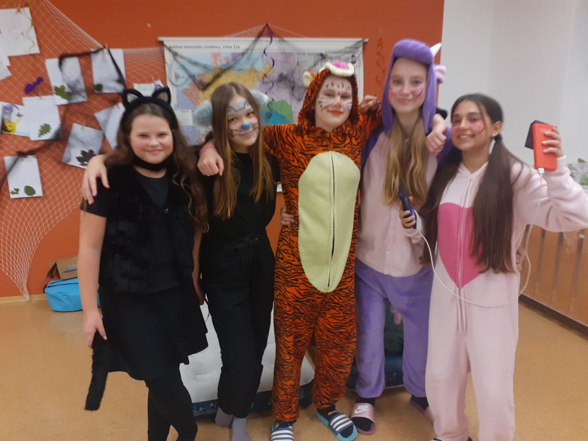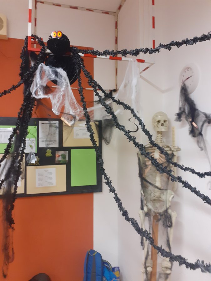 Spaní jsme spojili se svátkem Halloween a také to v tomto duchu pojali. Děti si nazdobily třídu a kam jste se podívali, byli pavučiny, kosti, prsty, pavouci, dýně a vše, co s tímto svátkem souvisí. Také si zdobení pořádně užily. U školy jsme se sešli už za tmy. Dlabali jsme dýně, měli bohaté občerstvení, o které se postarali sami žáci, malovali jsme na obličej, zahráli jsme hry, říkali si tajemné a strašidelné příběhy, které pro nás připravili ve slohu žáci 9.C. Ti měli v plánu také strašidelnou stezku odvahy, ale bohužel to nebylo možné z důvodu jejich karantény zrealizovat, což je i nás velmi mrzelo. Ale i tak se zjednodušená stezka odvahy povedla a všichni jsme pak alespoň na pár hodin spokojeně usnuli. Už se těšíme na další společně strávené chvíle, nejen v hodinách.