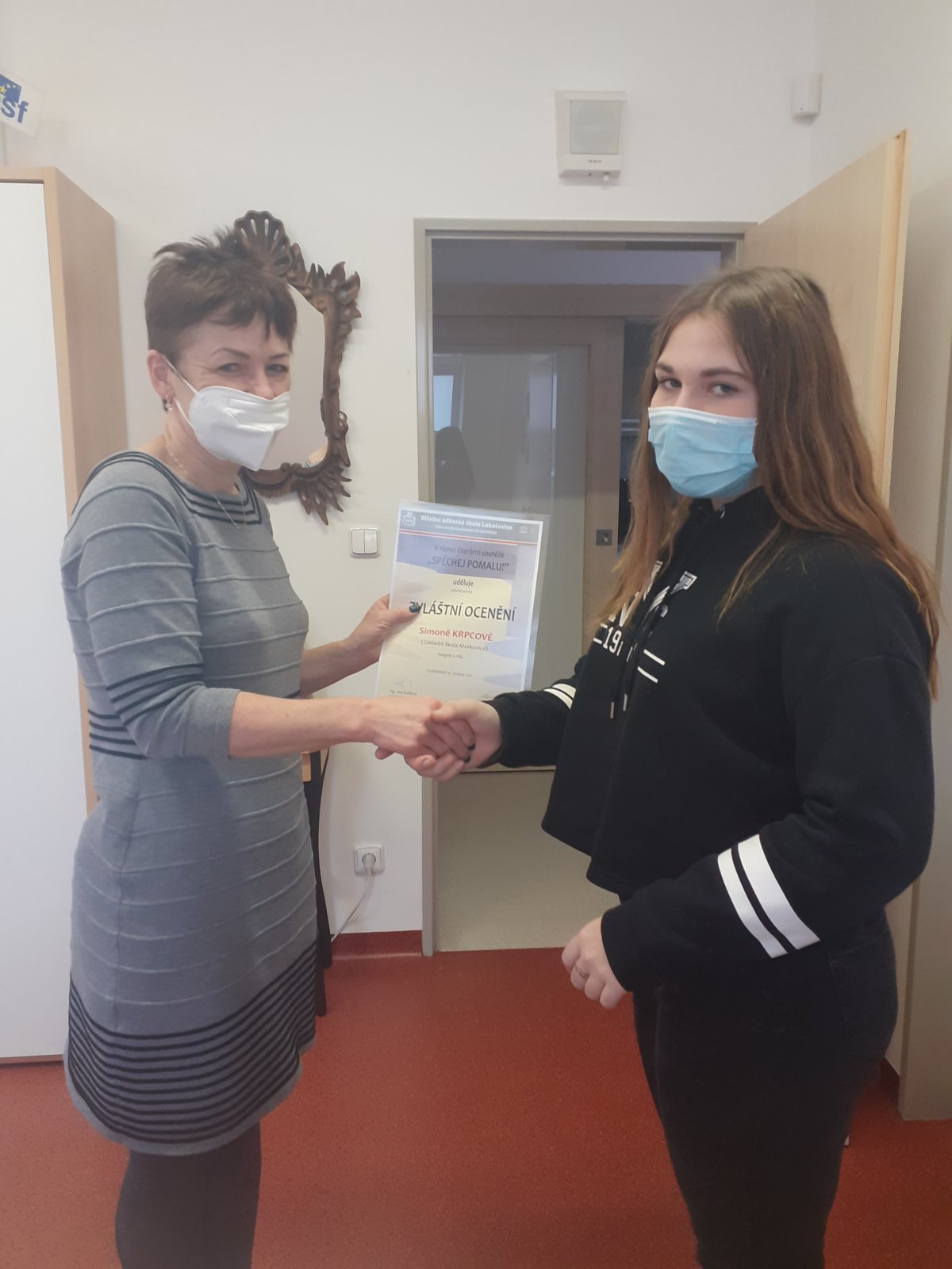 Úspěch jsme slavili například v literární soutěži Spěchej pomalu, kterou pravidelně pořádá SOŠ v Luhačovicích. Do soutěže byly poslány práce několika žáků třídy 9.C, z nichž se porotě velmi líbil příběh zpracovaný Simonou Krpcovou. Bylo ji uděleno zvláštní ocenění, které si v lednu osobně převzala přímo ve škole v Luhačovicích. Téma práce nebylo nijak omezeno. Žáci mohli vymýšlet hororové, fantasy, dobrodružné příběhy, ale také třeba komiksově zpracovat svůj příběh. Další literární a zároveň i výtvarná soutěž, které jsme se již v minulosti zúčastnili, nese název Malovat a přežít. Opět se do ní zapojili žáci 9.C, kteří malují, píší, vytváří koláže. Tato soutěž se teprve uskuteční a organizátorem je Památník Terezín. A protože jsou žáci moc šikovní, věřím, že se i v této soutěži některé práce umístí a budou oceněny.
