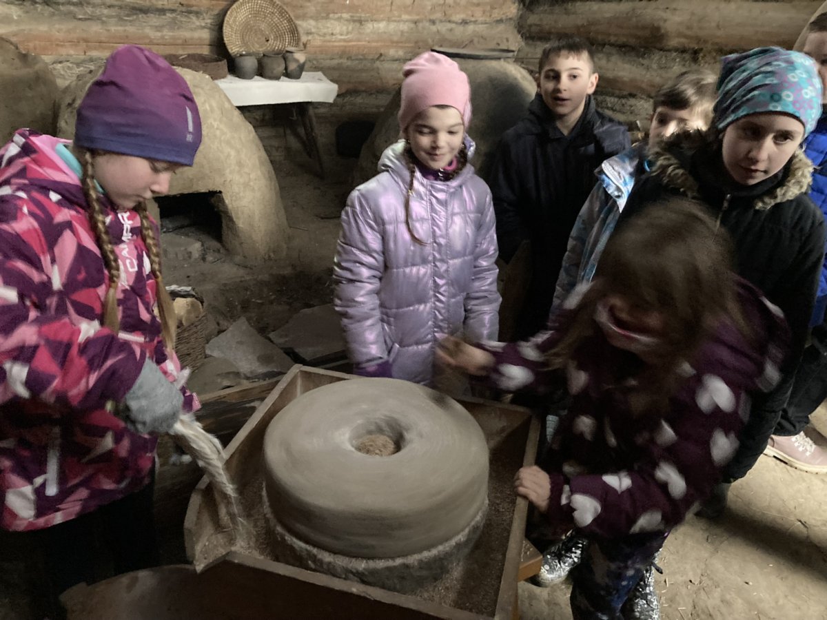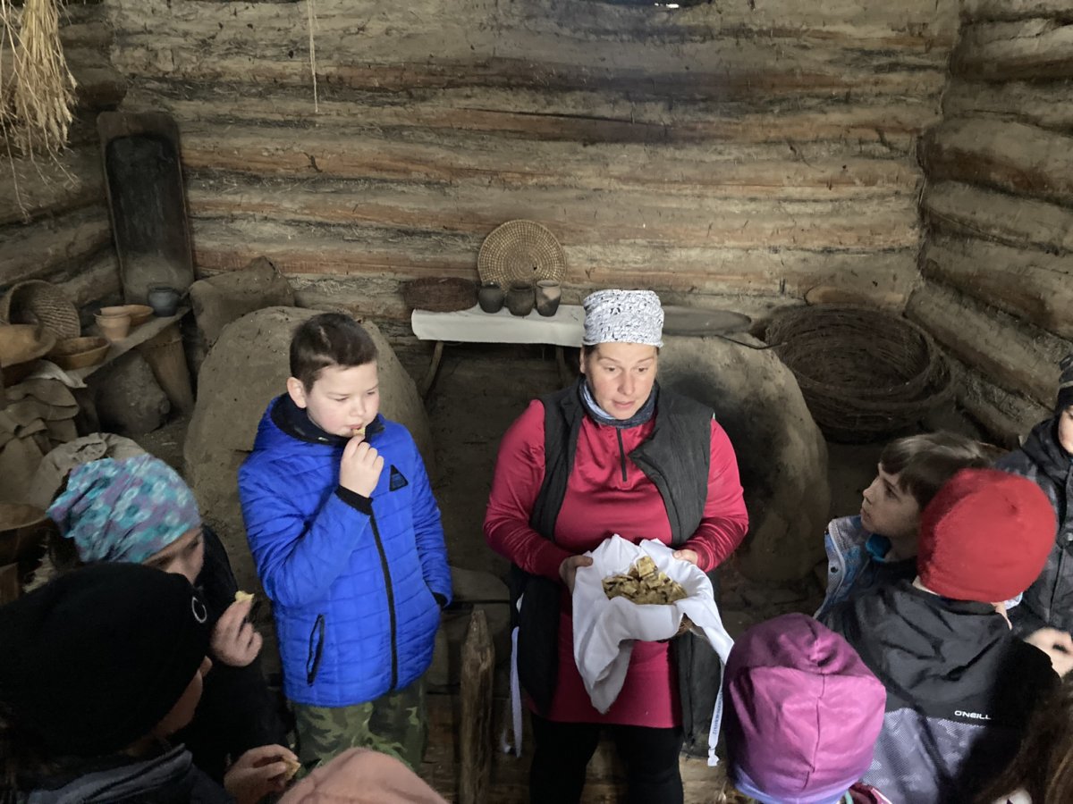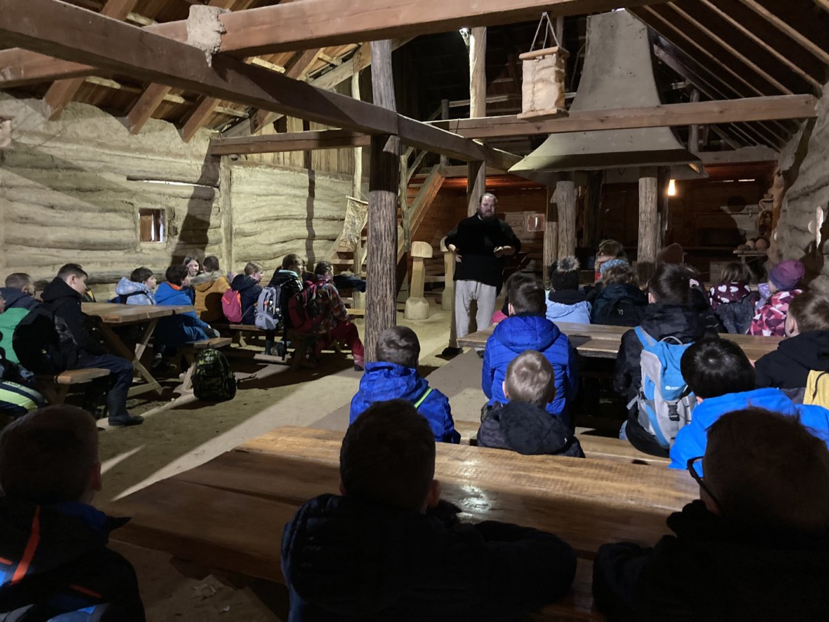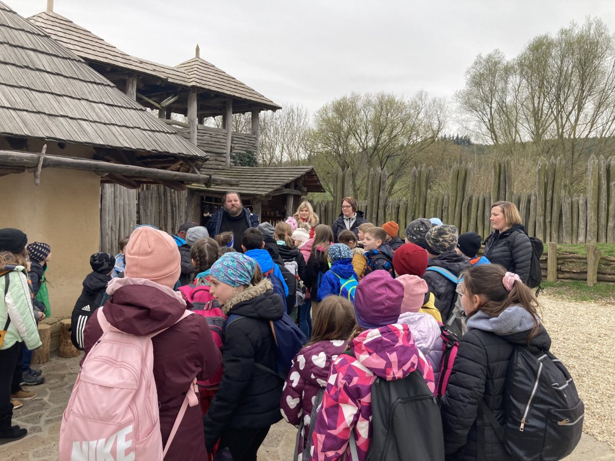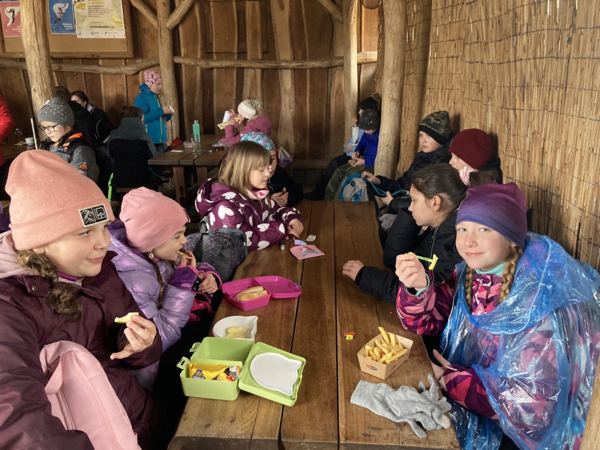 Ve čtvrtek 14. dubna jsme se my - třídy 4.A a 4.B společně vydaly v rámci výuky vlastivědy a přírodovědy do velkomoravského opevnění - Archeoskanzenu a do Živé vody v obci Modrá u Velehradu. I když nám počasí nepřálo, neodradilo nás to a dobrodružnou výpravu jsme si všichni užili. Vytiskli jsme si svoje jméno staroslovanským písmem - hlaholicí, na hrnčířském kruhu jsme zhlédli výrobu keramických nádob, namleli jsme na kamenném mlýnu mouku a dokonce jsme ochutnali výborné ovesné placky. V akváriu Živé vody jsme viděli plavat spoustu druhů ryb, dokonce i želvičky, ale nejvíc nás zaujal bílý sumec. Naši výpravu jsme ukončili v cukrárně.
