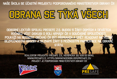 Vlastní průběh projektu byl realizován formou přednášky, kde odborný lektor spolku PRESAFE seznámil žáky s obecnými informacemi o branné povinnosti, koho se týká a za jakých podmínek, pohovořil o systému obrany státu a o možnosti dobrovolné participace na ni, probral s žáky význam armády ČR a seznámil je se zásadami chování při mimořádných událostech.