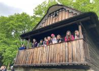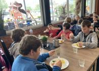 Pak nás autobus odvezl do restaurace v Campingu, která měla 3 hvězdičky od Zdeňka Pohlreicha, na výborný oběd. Hurá! Byl moc dobrý kuřecí řízek s bramborovou kaší. Po obědě jsme hráli ve třech týmech hry: chytání rybek, luštění morseovky, házení míčků, střílení z praku… a na odreagování skákání na velké trampolíně.