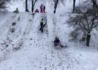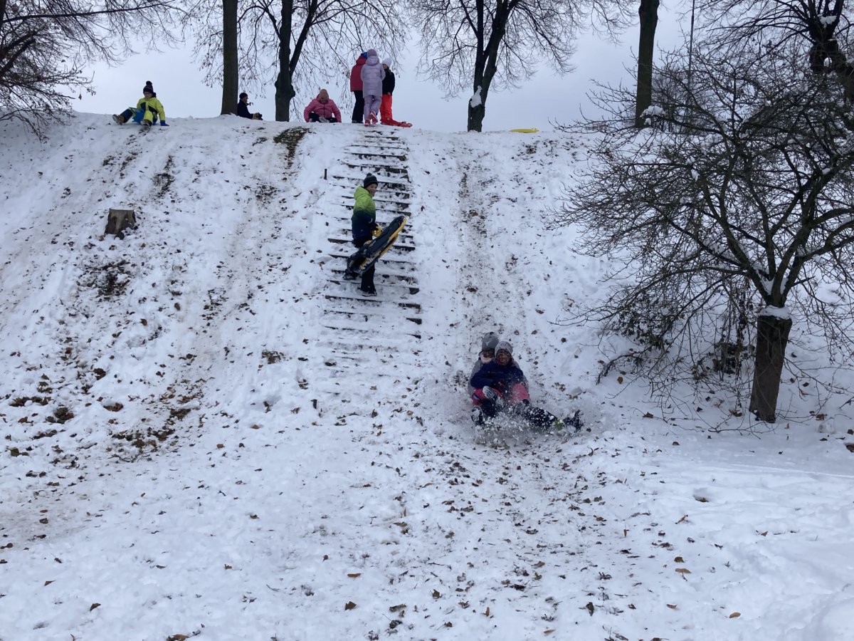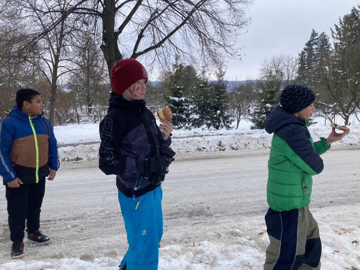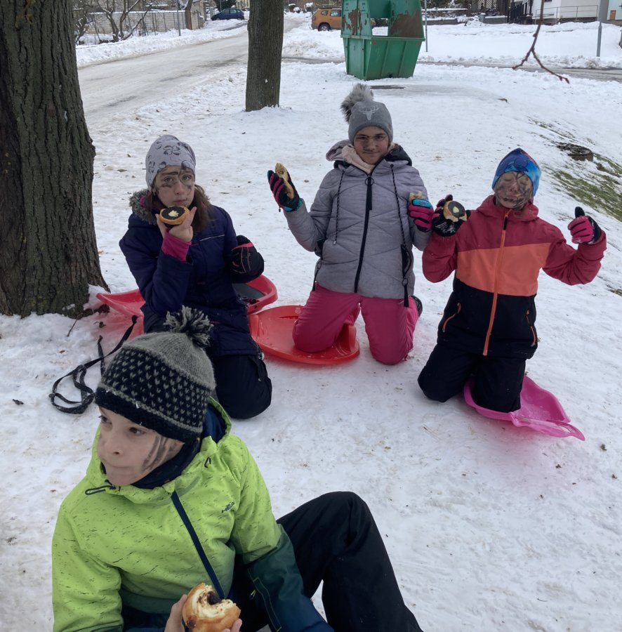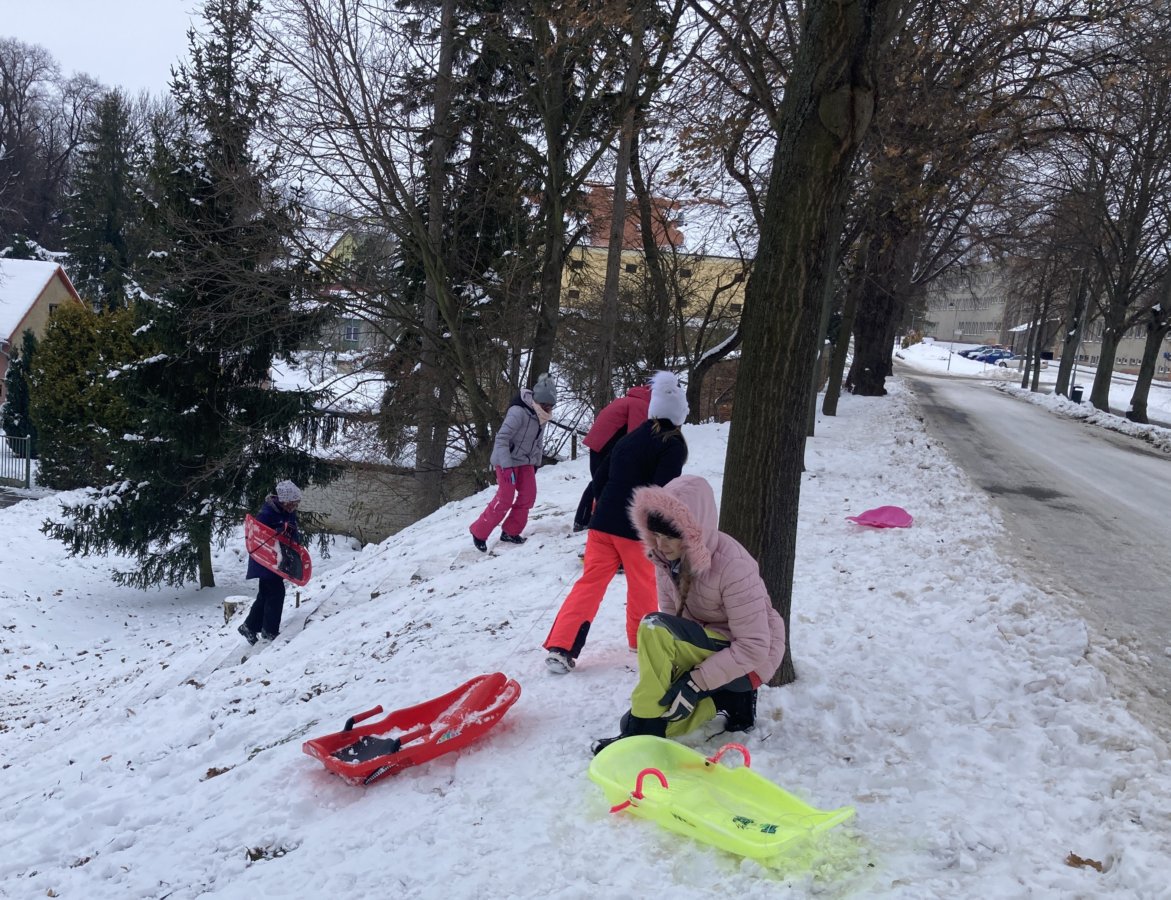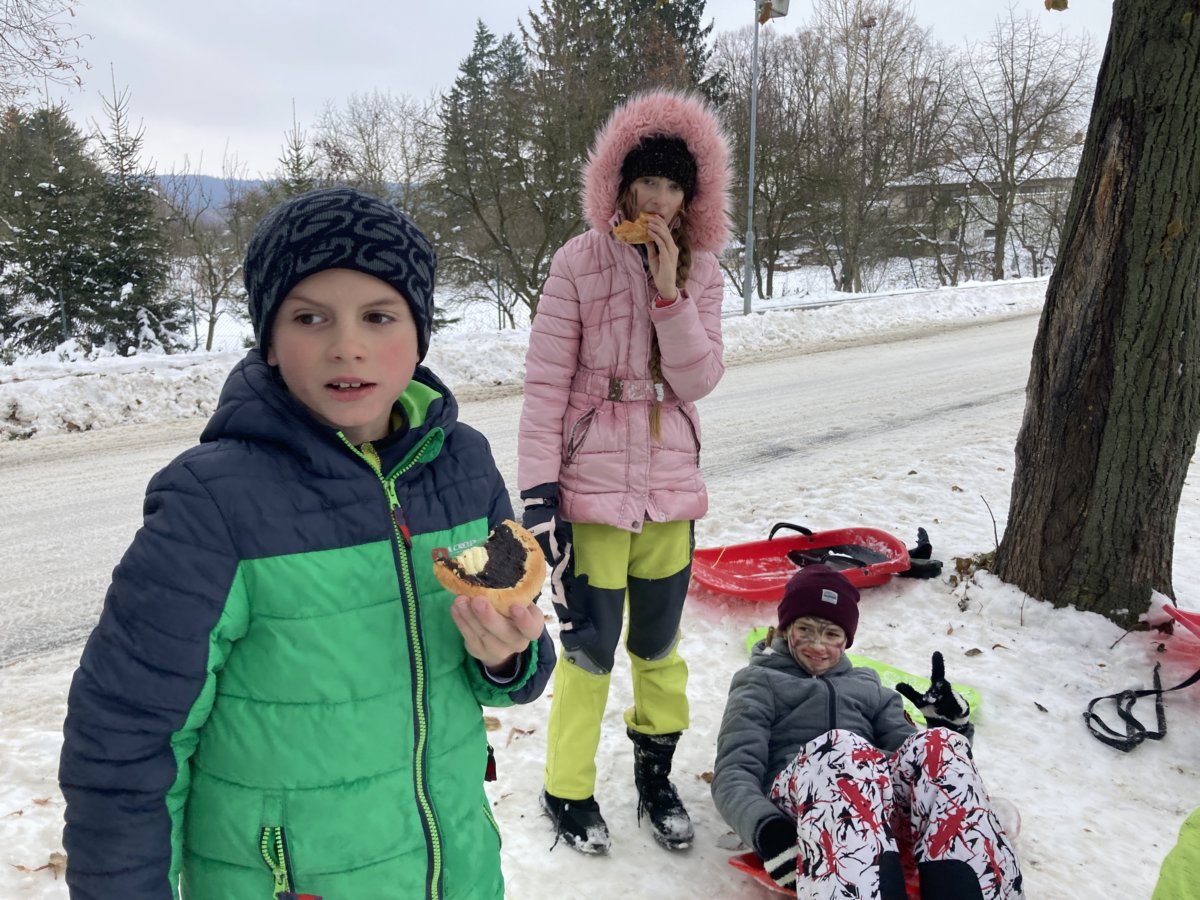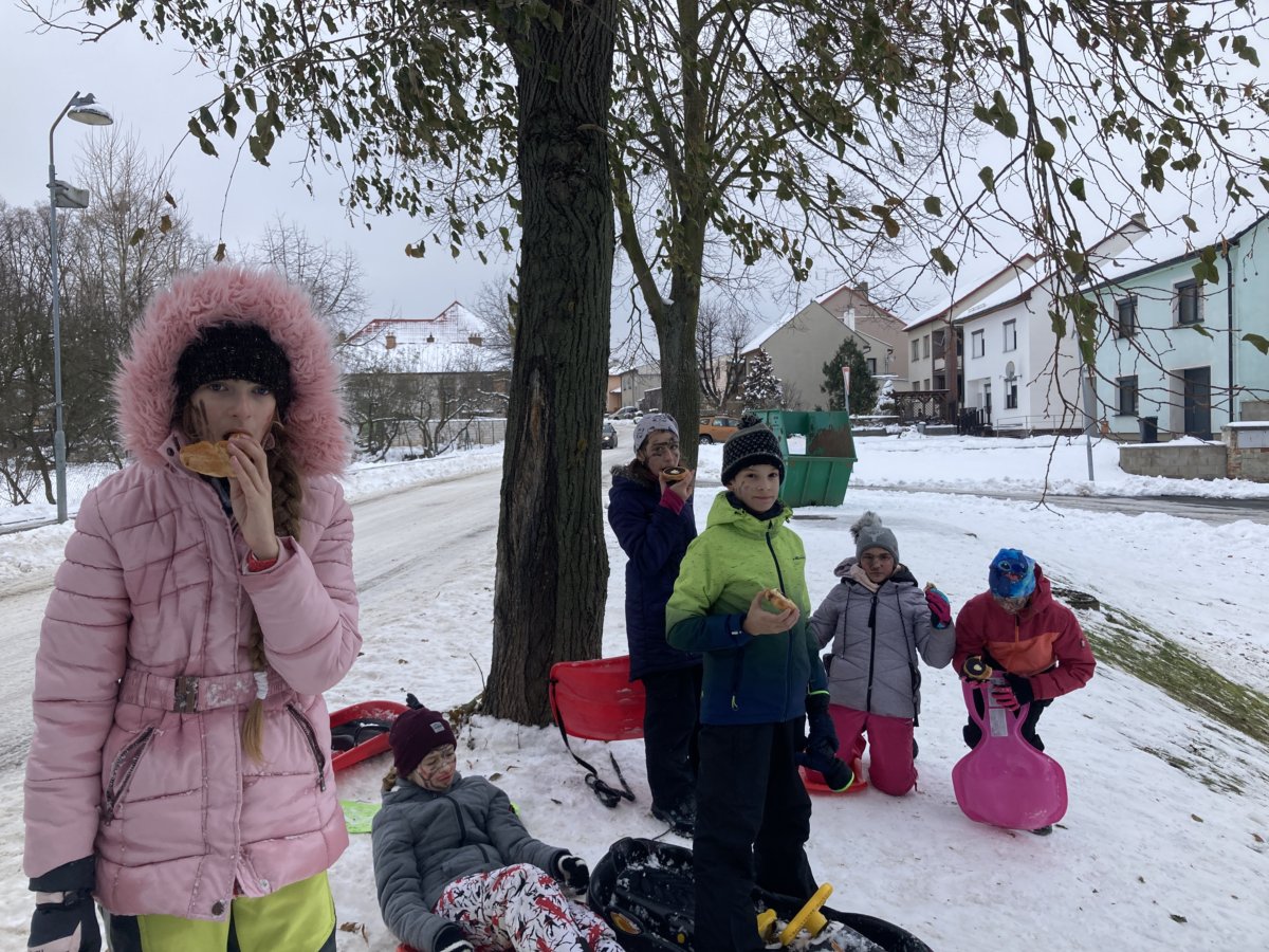 Konečně přišlo krásné zimní počasí a napadl sníh. My jsme si v rámci tělesné výchovy vyrazili za zimními radovánkami – tedy bobovat a sáňkovat na ulici Sokolská k Ovčáčku. Užívali jsme si, řádili jsme a byli jsme velmi spokojení. Pomalu jsme se chystali k odchodu do školy, když najednou se objevil pohádkový dědeček – pan Miroslav Hamala s podnosem plným koláčů a se slovy: "Malá svačinka, děcka!"