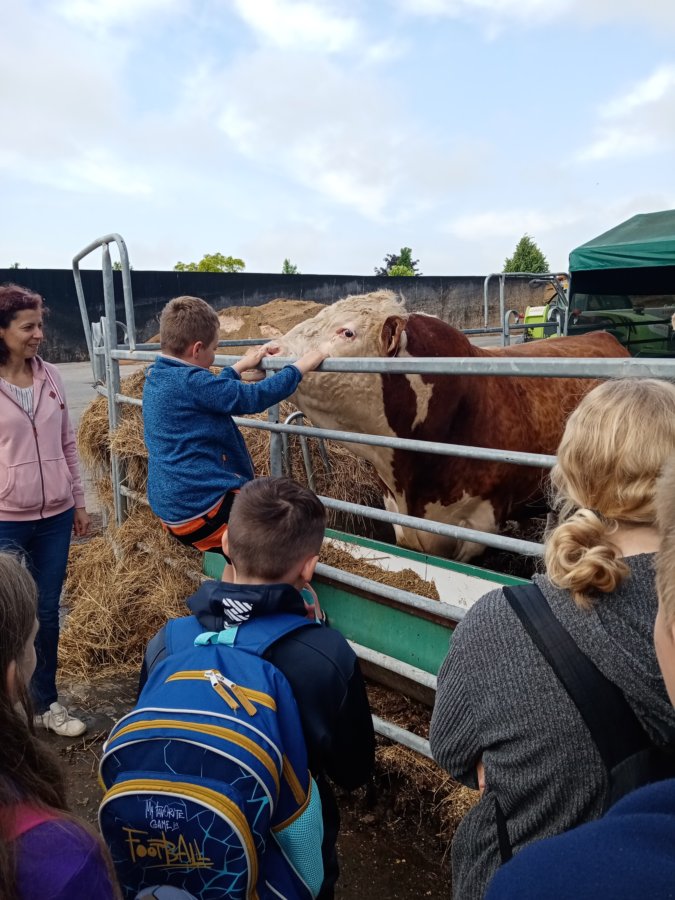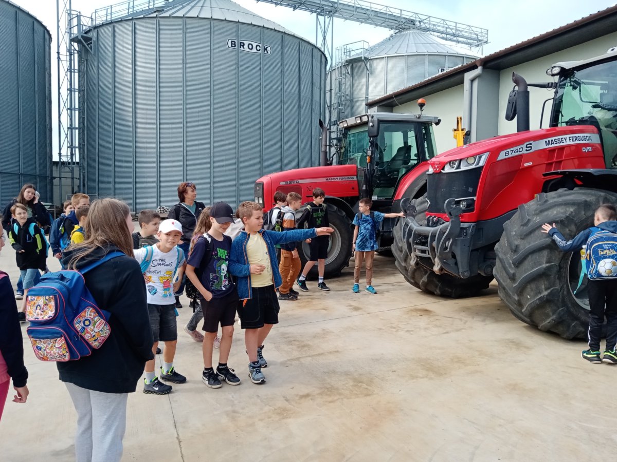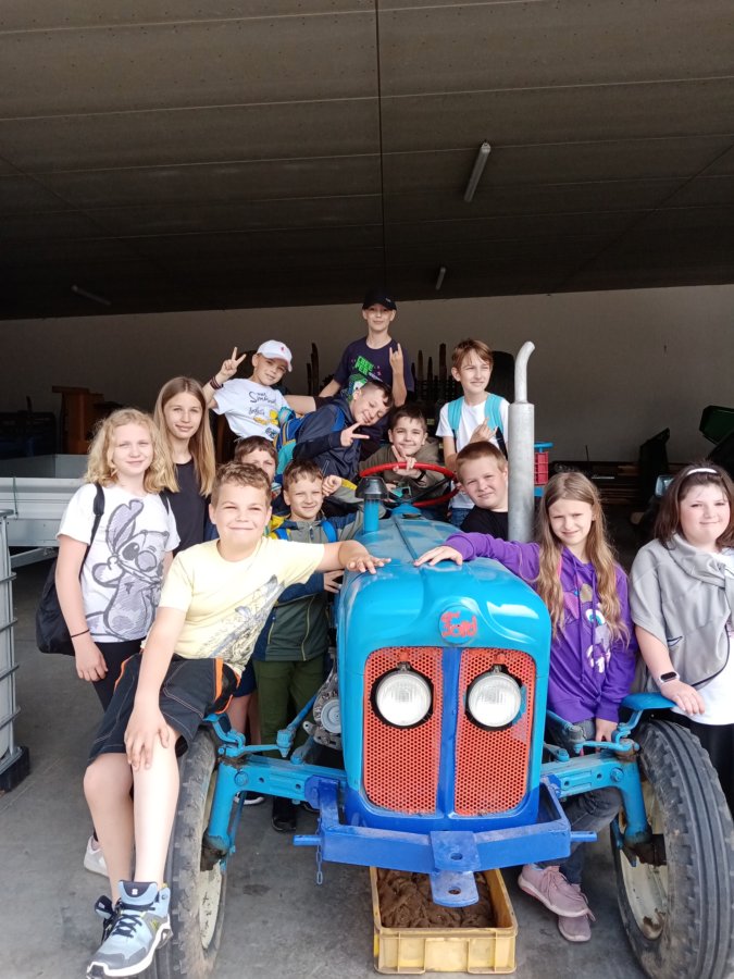 Přivítal nás i s jeho maminkou. Společně nás provedli po areálu farmy. Dozvěděli jsme se o výrobě bioplynu a jeho využití, prohlédli jsme si nádrž bioplynové stanice a sila, získali jsme informace o zemědělské technice, kterou používají. Mohli jsme si posedět v historickém traktůrku Fordson dexta. Dokonce jsme si pohladili býky.