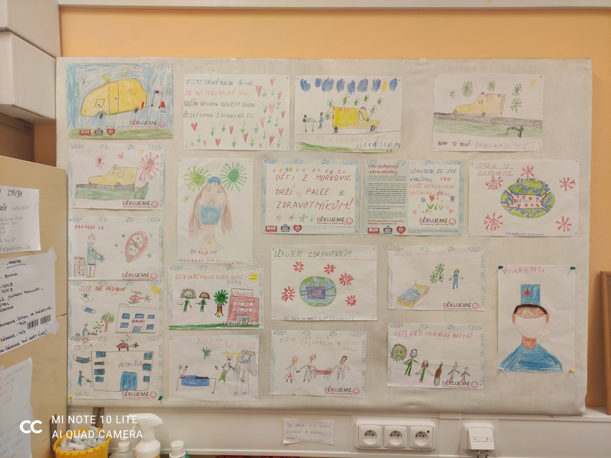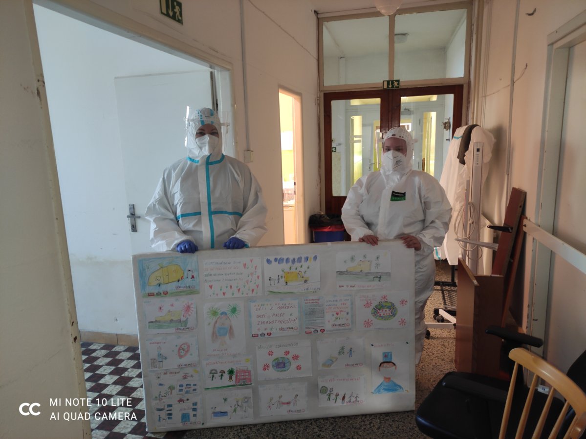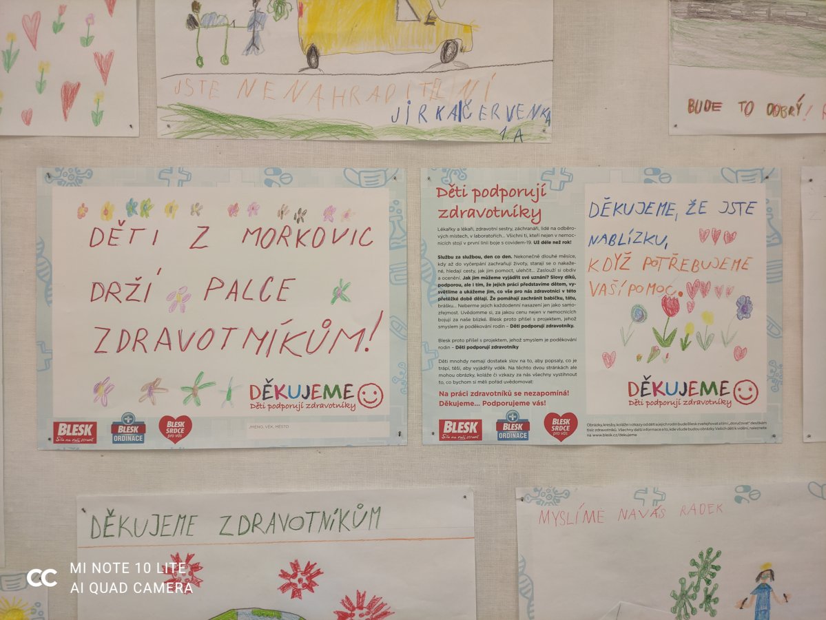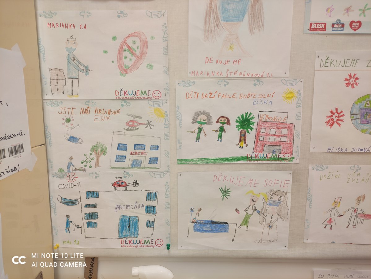 I v době rotační výuky na 1. stupni ZŠ navštěvovaly některé děti školní družinu. V 1. oddělení se střídali žáci z 1.A a ze 3. A. Jsou to děti všímavé a tak i přes svůj věk dobře vědí, co se kolem nich děje. Všechny vnímají situaci, která nastala v souvislosti s korona virovou nákazou. Povídali jsme si o těžké a vyčerpávající práci zdravotníků, o jejich rodinách, které se často bez nich musí obejít, o dlouhém čase, který v nemocnicích věnují péči o spoustu pacientů. A z toho vznikl nápad nakreslit si obrázky ze života zdravotníků a z jejich práce a věnovat je zaměstnancům Kroměřížské nemocnice, aby je potěšily a zlepšily jim náladu. Od nápadu nebylo daleko k činu a tak vznikly krásné obrázky doktorů, sestřiček, sanitek i zdravotnických vrtulníků. Vybrali jsme ty nejhezčí a poslali je zdravotníkům. Dělají teď radost zaměstnancům odběrového místa v areálu Kroměřížské nemocnice.