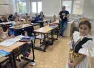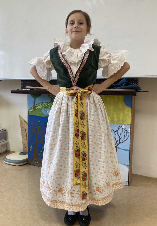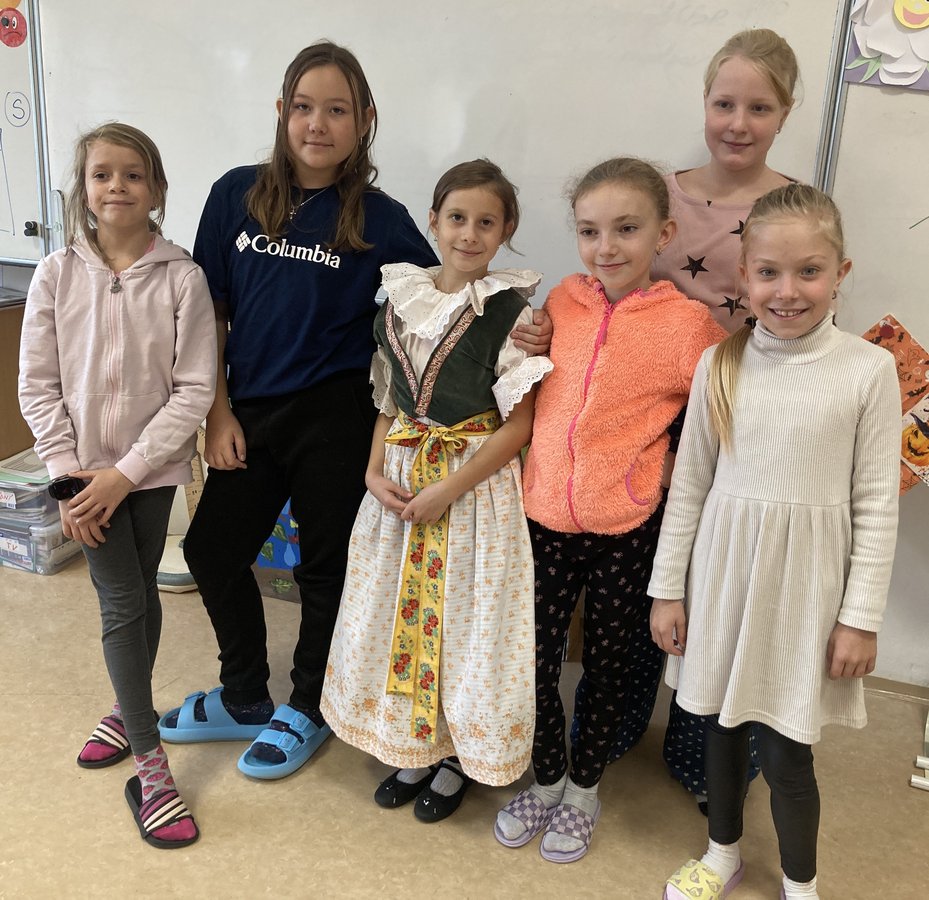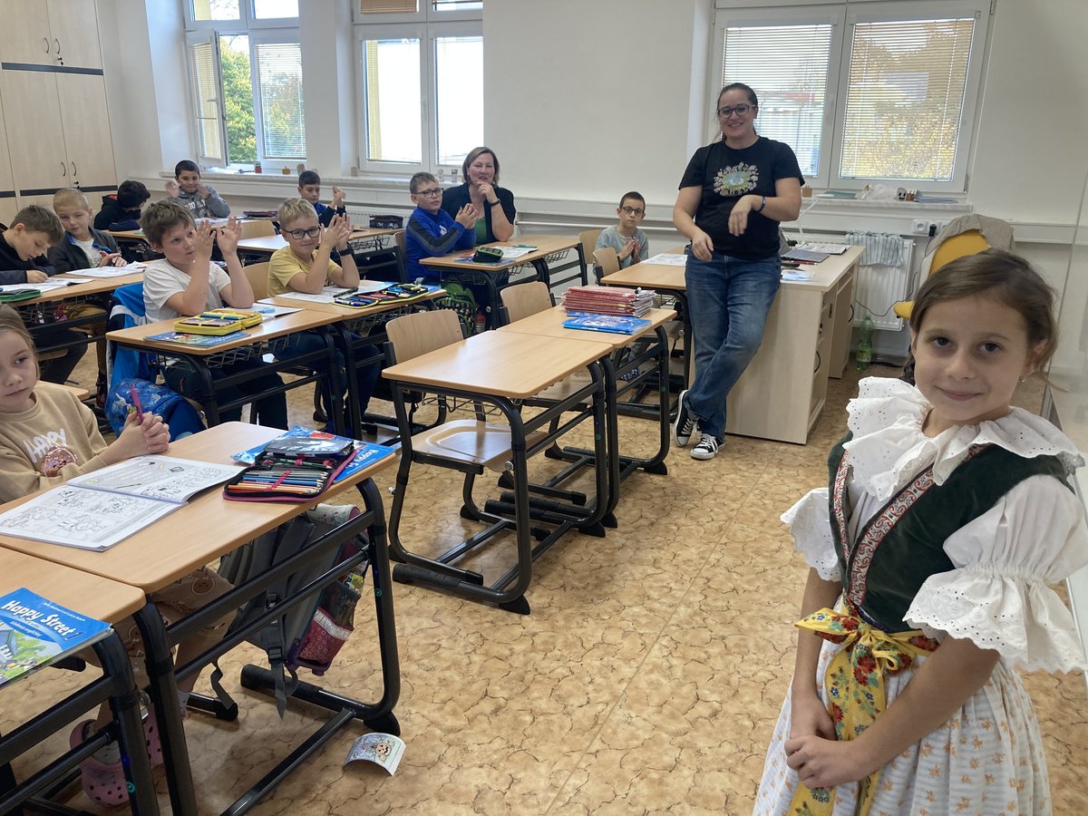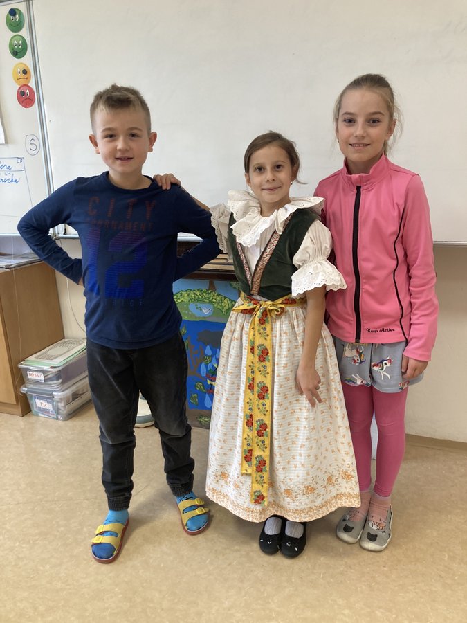 Velkým překvapením byl pro nás příchod spolužačky Elišky Smutné v hanáckém lidovém kroji. Se svým proslovem v hanáckém nářečí obešla všechny třídy 1. stupně a sklidila za svůj milý projev velký obdiv a často i potlesk. Moc jí za to děkujeme.