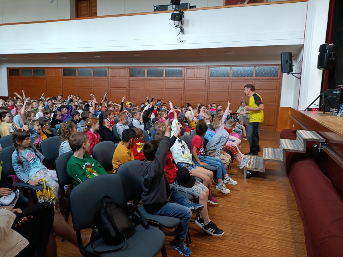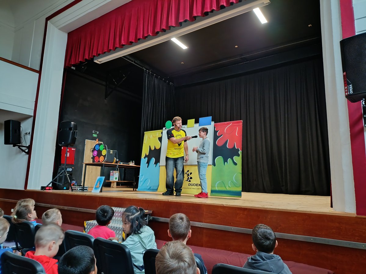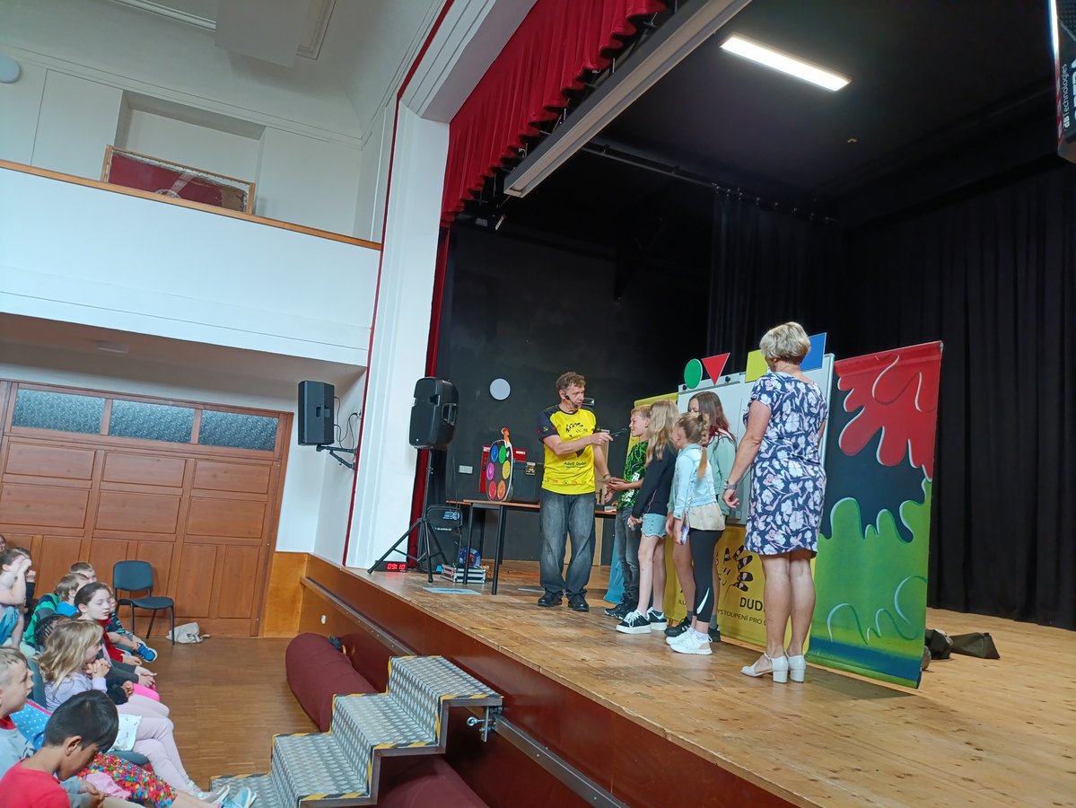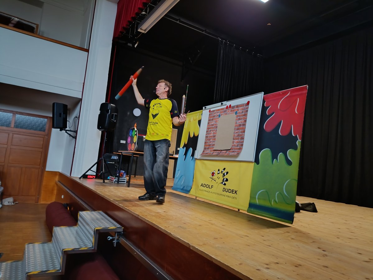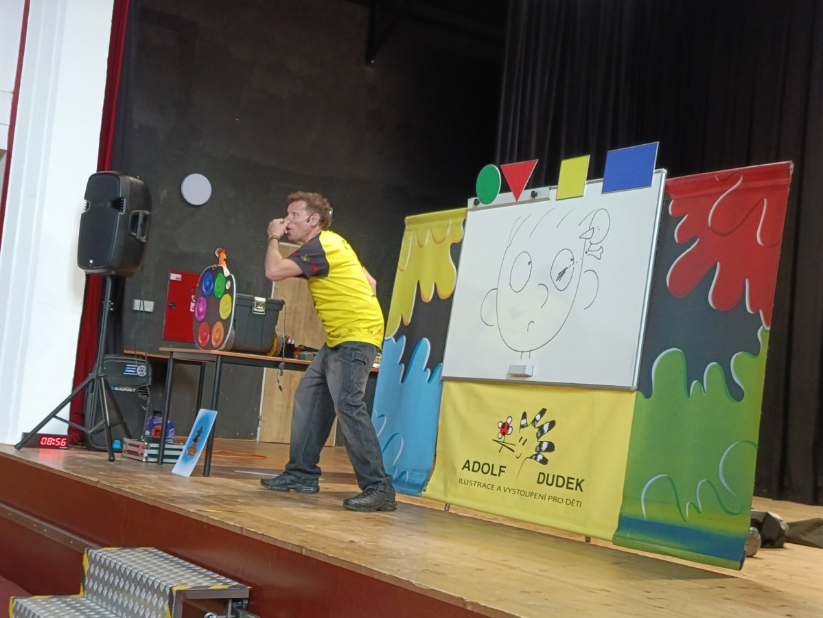 V úterý 3. 6. se všichni školáci 1. stupně naší školy vydali do sokolovny, kde je očekával ilustrátor dětských knih Adolf Dudek se svým programem „Malování pro děti“.