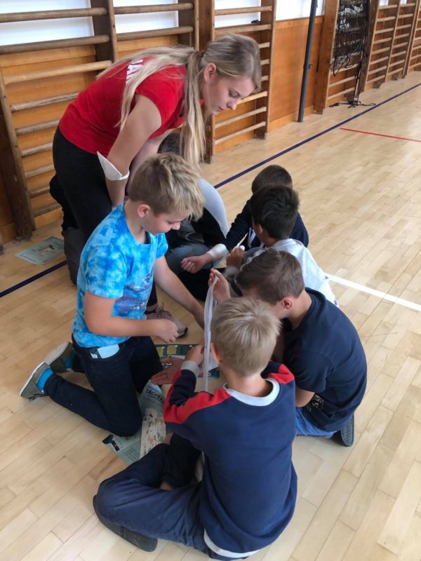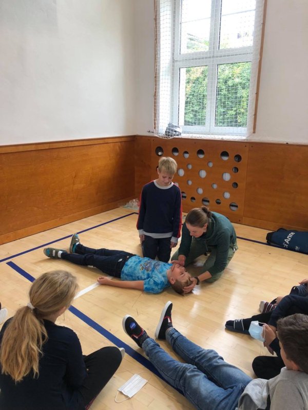 Dne 20. září se žáci 5. ročníků zúčastnili výukového programu první pomoci a zdravovědy pod vedením studentů z lékařské fakulty Masarykovy univerzity. Žáci si vyzkoušeli, jak přivolat a poskytnout první pomoc nejen paní učitelce ale i svému kamarádovi. Nejdříve si však své znalosti ověřili při teoretickém testu, kde společně hlasovali pro správnou odpověď. Poté si měli možnost vše prakticky vyzkoušet. Seznámili se s tím, jak se váže trojcípý šátek a jak si správně zafixovat zlomeninu či tržné poranění. Své postřehy si tak následně ověřili v rámci praktických her a cvičení.