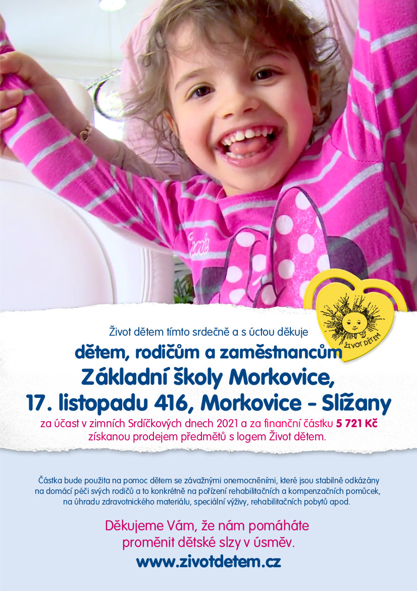 Život dětem tímto srdečně a s úctou děkuje dětem, rodičům a zaměstnancům Základní školy Morkovice, za účast v zimních Srdíčkových dnech 2021 a za finanční částku 5 721 Kč získanou prodejem předmětů s logem Život dětem. Částka bude použita na pomoc dětem se závažnými onemocněními, které jsou stabilně odkázány na domácí péči svých rodičů a to konkrétně na pořízení rehabilitačních a kompenzačních pomůcek, na úhradu zdravotnického materiálu, speciální výživy, rehabilitačních pobytů apod.