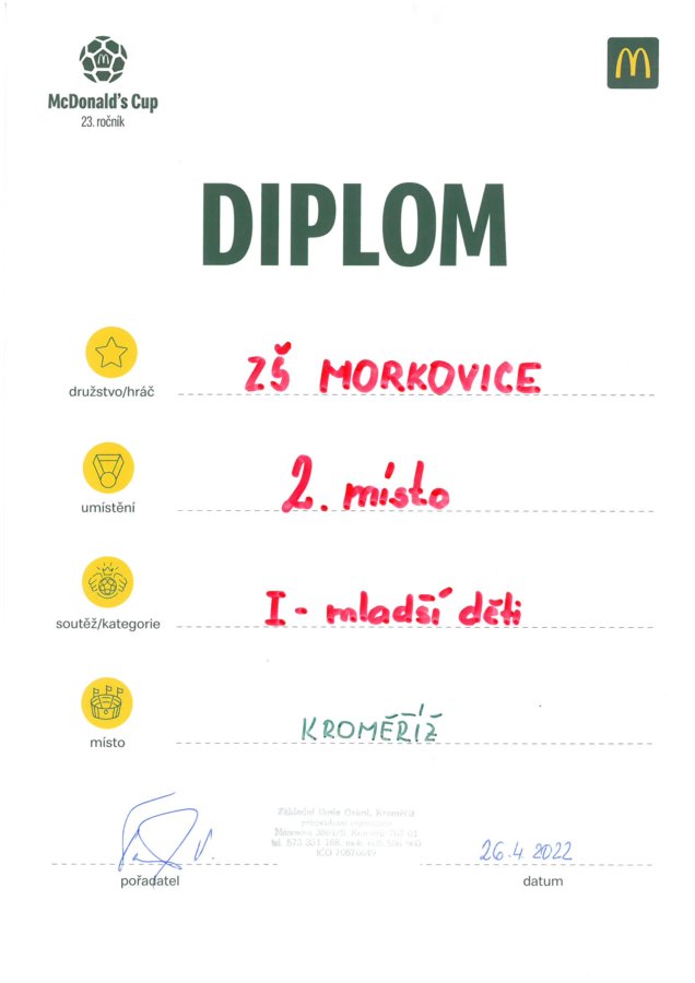 Gratulujeme našim fotbalistům z 1. - 3. třídy k nádhernému 2. místu v Mc Donald's Cupu a přejeme jim do okresního finále hodně zdaru.