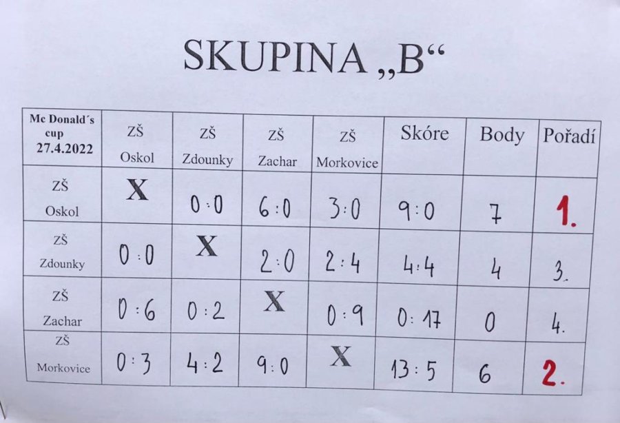 K úspěchu našich mladších spolužáků z 1.- 3. tříd se v okrskovém kole připojili i fotbalisté ze 4.- 5. tříd naší školy. Ti dokonce v turnaji zvítězili a postoupili do okresního kola z 1. místa. Hráli pod vedením svých trenérů a skvělých tatínků p. P. Shromáždila, D. Vlčka a L. Tesaře, kteří se o naše sportovce s nadšením starají.